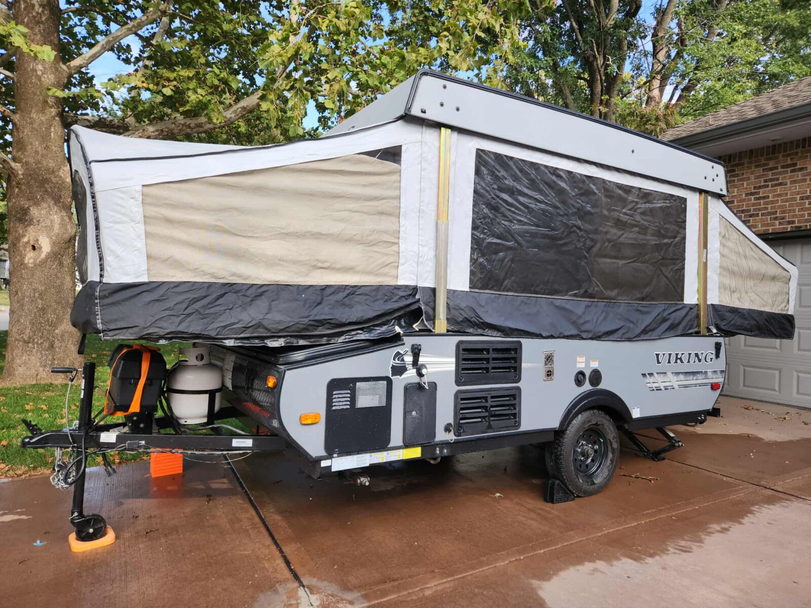 - 2020 Viking pop up camper, make FRRV, VIN:5ZT1VKECOL5016984, outdoor roof top A/C and propane Furnace, exterior grill with propane attachment, awning, standard power refrigerator low voltage and line voltage, dinette, bench seating front storage bay, bike rack mount, spare tire, lots of extras, leveling blocks, power cords, hoses, inline water filter, and pressure reducing valve, all the power adapters for outside hook up plus additional water hose and extension cords, outside stove, sleeps six, great condition;